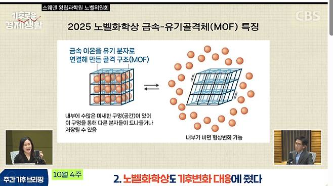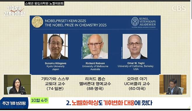 ◇ 최서윤> 노벨화학상 화두도 기후변화 대응…탄소 잡는 고체화합물 영예. 올해도 노벨상 수상자 발표가 완료됐죠. 이제 12월 시상식만 남겨두고 있는데요. 올해는 화학상에서 기후변화 대응 관련 연구 성과가 나와 소개해 드리려 합니다.