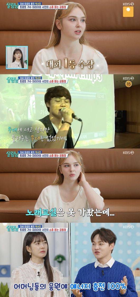 마리아 이야기를 듣고 자신의 무명시절을 떠올린 박서진은 “나도 그랬다”라면서도 “(마리아는) 나보다 더했을 것 같다. 언어의 장벽이 있을 거고, 외국인이라는 시선도 있을 거 같고 그거를 깨고 넘기가 19살의 나이로 감당하기 힘들었을 거 같다는 생각이 들기도 하다”라고 격려했다.