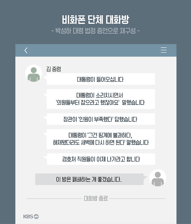 박 대령은 "'대통령이 들어오십니다' 다음에, '소리치시면서 의원들부터 잡으라고 했잖아요', '김용현 장관께서 인원이 부족했다', '대통령께서 그건 핑계에 불과하다, 해제됐더라도 새벽에 다시 하면 된다' 이 정도로 (메시지 내용을) 기억하고 있다"고 밝혔습니다.