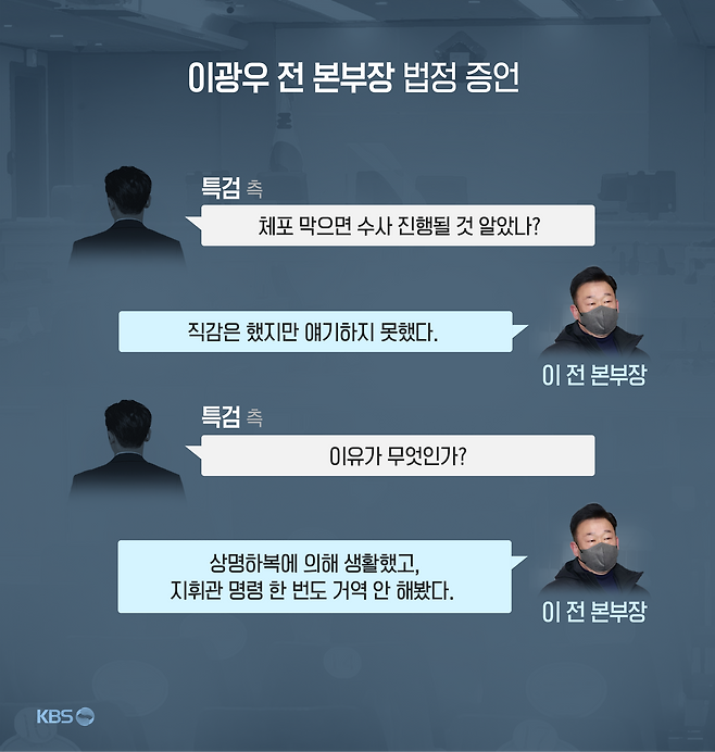 "체포영장 집행 방해 의도가 있었던 거냐"는 특검 측 질문에 이 전 본부장은 "그렇지 않다"며 "지휘부가 그런 의지를 보이니까, 그런 답변을 한 것"이라고 답했습니다.