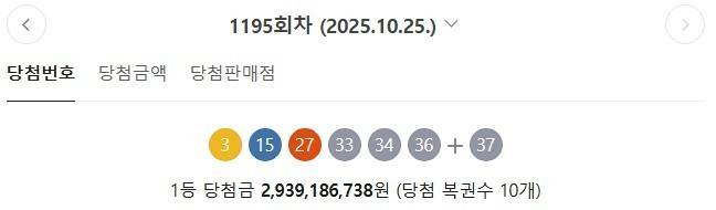 로또복권 운영사 동행복권은 제1195회 로또복권 추첨에서 '3, 15, 27, 33, 34, 36'이 1등 당첨번호로 뽑혔다고 오늘(26일) 밝혔습니다. 2등 보너스 번호는 '37'입니다.