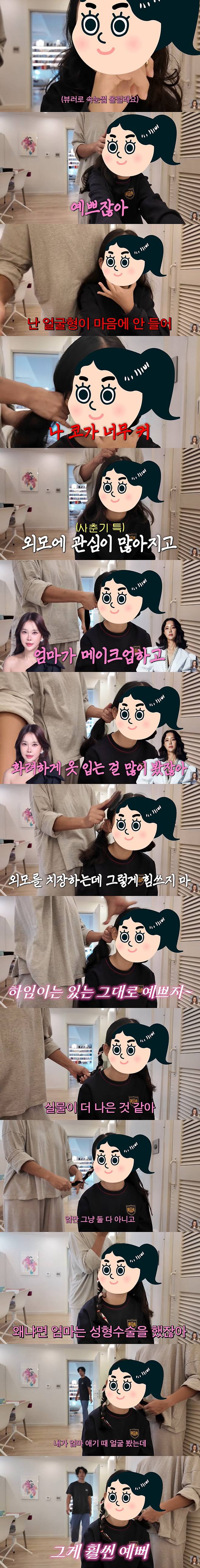 이어 하임 양은 "난 얼굴형이 마음에 안 든다. 입술이 너무 두껍다. 코가 너무 크다"고 하자, 백지영은 "진짜 사춘기인가 보다. 이렇게 시작되는 건가보다. 외모에 관심이 많아지고"라고 했다.