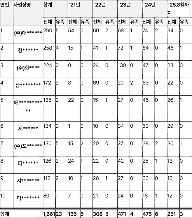 <표1> 인천지역 산재신청 상위 10개 건설업 사업장 산재(승인) 현황(2021~2025.8월)(단위: 건)