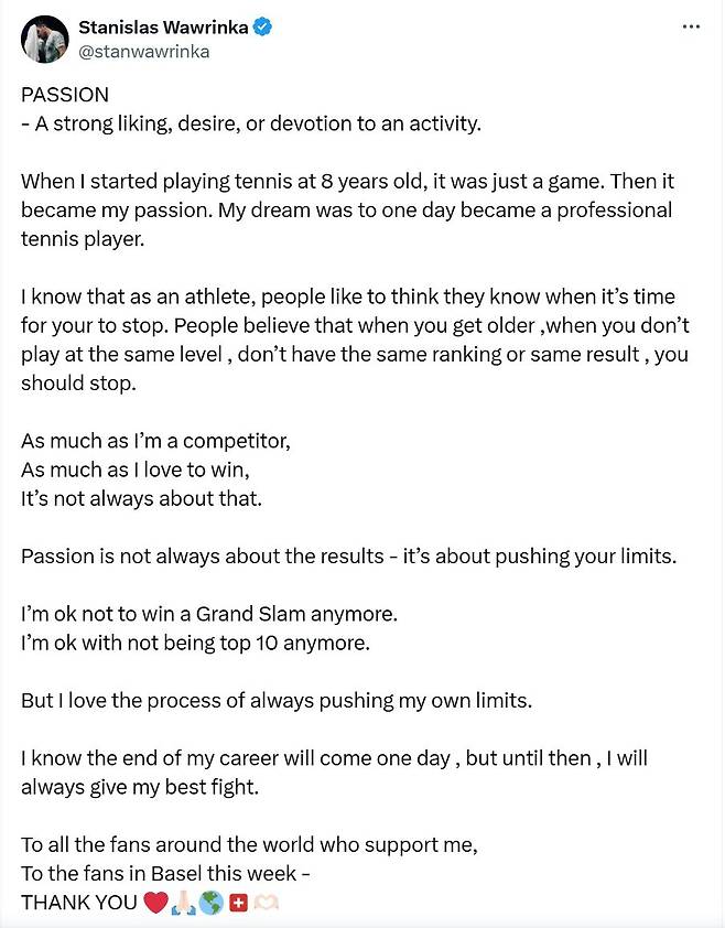 언젠가 은퇴의 때가 올 거라는 걸 알고 있지만 그때까지는 항상 최선을 다할 것입니다. 전 세계 테니스 팬 여러분, 그리고 이번 주 바젤에서 응원해주신 여러분, 정말 감사합니다. 여러분의 응원은 저에게 무엇보다도 소중합니다.
