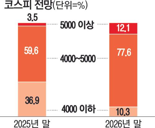내년 말 코스피 수준을 묻는 질문에 응답자의 77.6%가 4000~5000, 12.1%는 5000 이상을 전망했다.