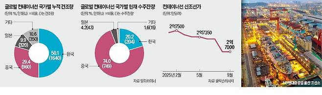 26일 영국 해운시장조사업체 알파라이너에 따르면 이달 기준 글로벌 컨테이너선 수주잔량은 1000만TEU(1TEU=20피트 컨테이너 1개)로 역대 최대치를 기록했다. 이 중 중국 조선사가 74.0%(749만TEU)를 차지했고, 한국 점유율은 20.2%(204만TEU)에 그쳤다.