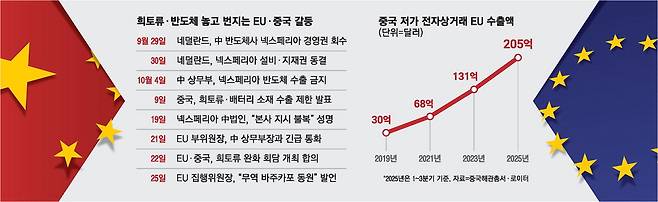 앞서 지난달에는 반도체를 둘러싼 충돌도 발생했다. 네덜란드 정부는 중국 윙테크가 인수한 반도체업체 넥스페리아 경영권을 사실상 장악하고 핵심 자산과 지식재산권을 동결했다. 이에 중국 상무부는 넥스페리아 중국 공장의 반도체 수출을 전면 금지했고, 넥스페리아 중국 법인은 "본사의 지시를 따르지 않겠다"고 반발했다. EU는 이 사안을 공급망 안보 리스크의 대표 사례로 다루며 논의를 확대했다.