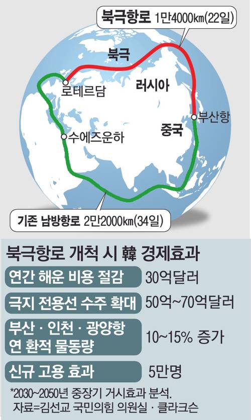 김선교 국민의힘 의원실을 통해 받은 한국해양수산개발원(KMI) 분석 보고서에 따르면 북극항로 개척 시 2030~2050년 해운 비용 절감 효과는 연간 30억달러에 달할 것으로 추산됐다. 부산·인천·광양항 환적 물동량은 10~15% 증가하고, 해운·항만·연료 분야 등에서 신규 고용이 5만명 늘어날 것으로 기대된다.