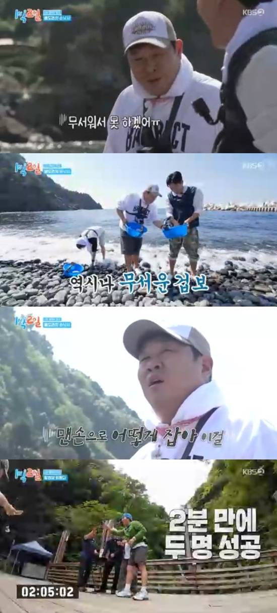 아래팀은 소라찜을 걸고 5분 동안 베도라치 많이 잡기 대결을 시작, 1마리 차이로 김종민이 승리했다.