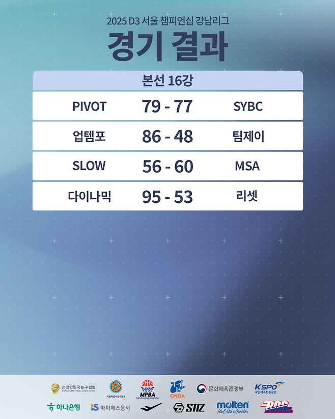 PIVOT은 26일 강남스포츠문화센터에서 열린 2025 D3 서울 챔피언십 농구 디비전리그 16강에서 연장까지 가는 혈투 끝에 SYBC를 79-77로 제압, 8강에 진출했다.