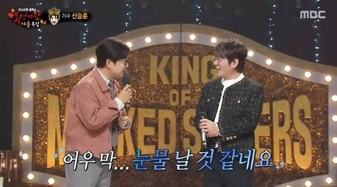 MC 김성주는 신승훈을 보자 "복면가왕 10주년에 10년의 공백을 깨고 나와주셨다"며 "눈물이 날 것 같다"고 벅찬 감정을 전했다.