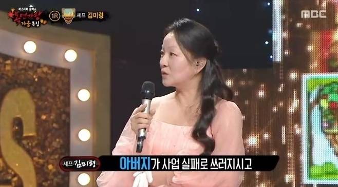 김미령은 "아버지가 사업 실패로 쓰러지셨다. 어머니가 돈 벌러 나가셔서 초등학교 때부터 요리를 했다"며 "훌륭한 요리 학원에 다닌 것도 아니고 먹고 살기 위해서 요리를 했다"고 말했다. 이어 "주방에선 여유롭게 요리할 시간이 없다. 주방에서는 전쟁"이라며 "복면가왕 덕분에 못해본 걸 할 수 있었다"고 덧붙였다.