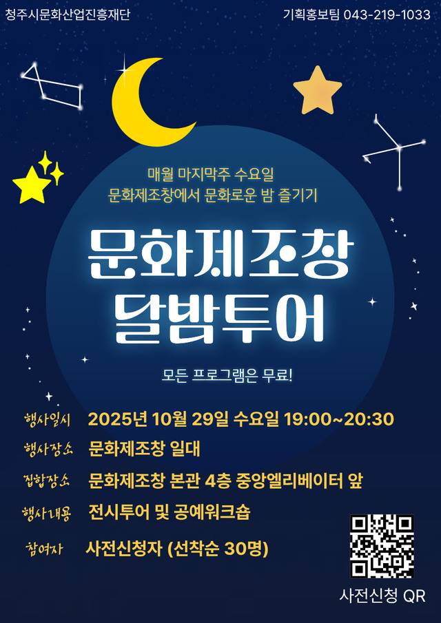 충북 청주시문화산업진흥재단은 오는 29일 오후 7시 '문화제조창 달밤투어' 참여자를 모집한다.