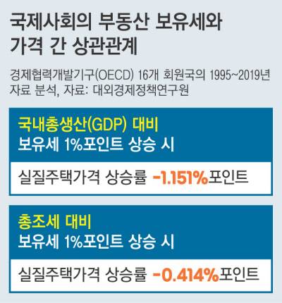 26일 대외경제정책연구원이 2021년 발표한 ‘국제사회의 부동산 보유세 논의 방향과 거시경제적 영향 분석’ 보고서를 보면, 경제협력개발기구(OECD) 회원국 16개국의 1995~2019년 자료를 분석한 결과 보유세 인상이 주택 가격 상승률 둔화에 영향을 미쳤다.