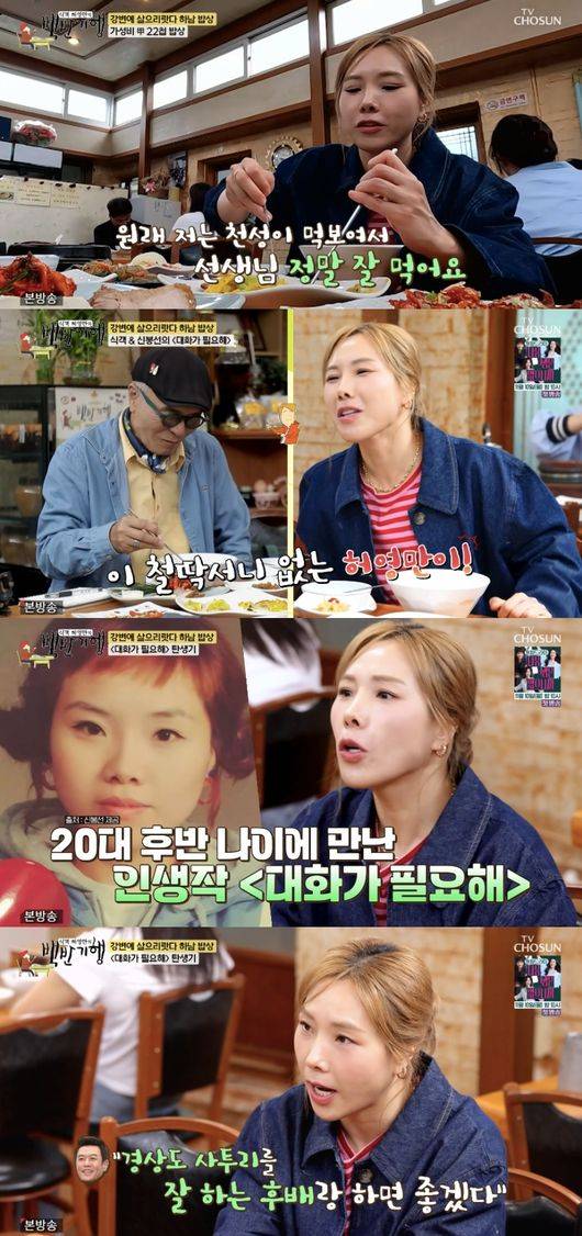 허영만은 ‘대화가 필요해’ 팬이라며 “언제 시작했냐”고 물었다. 신봉선은 “28살에 했다. 아들(장동민)이 저보다 한 살 많다”라며 “그때는 김대희 씨가 장인어른이 경상도 분이시다. 본인이 봤을 때는 어렵지만 개그 소재로 너무 재밌어보였다고 했다. 그래서 경상도니까 경상도 사투리 잘하는 후배였으면 좋겠다고 해서 (하게 됐다) 그래서 실제 저희 엄마가 쓰시는 말씀이다”라고 설명했다.