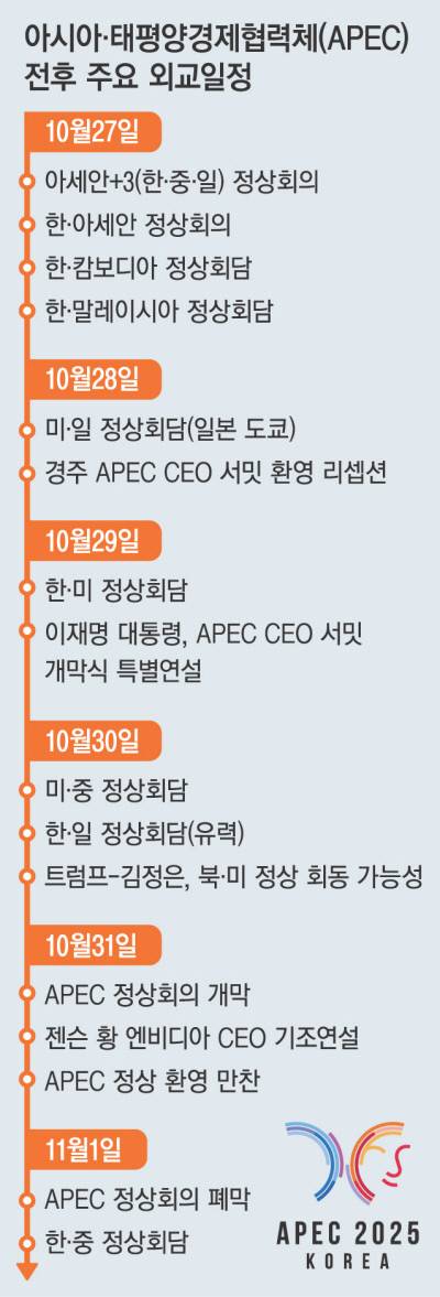 슈퍼위크 본무대는 오는 31일~다음달 1일 경북 경주에서 열리는 아시아·태평양경제협력체(APEC) 정상회의다. APEC 정상회의가 2005년 부산에서 개최된 후 국내에서 다시 열리는 건 20년 만이다. 미·중·일 등 21개 회원국 정상 등이 한국을 찾는다. 도널드 트럼프 미국 대통령과 시 주석은 국빈방문 형식으로 방한한다. 다카이치 총리도 취임 후 처음 한국을 방문한다.