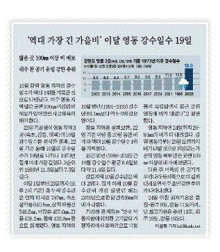 기후위기 대응 관련 질의에서도 본지 보도가 또 다시 언급됐다. 기본소득당 용혜인(비례) 의원은 “강원도의 가뭄은 어제오늘 일이 아니다”라며 “오늘자 강원도민일보 보도(10월 24일자 1면 ‘역대 가장 긴 가을비 이달 영동 강수일수 19일’·사진)를 보면, 올해 영동지역의 가을비 일수가 역대 최다였다. 기후위기로 인해 전혀 다른 기상 상황이 펼쳐지고 있다”고 지적했다. 이어 용 의원은 김진태 강원도지사에게 “극단적 재난 상황을 가정한 대비책을 철저히 마련해야 한다”고 촉구했다.이날 본지는 기상청 자료를 분석해 올해 10월 영동지역 강수일수가 1973년 관측 이래 최장인 19일에 달했다고 보도했다. 용 의원은 강원 연고 의원으로 부친이 홍천 출신, 모친이 정선 출신이다.