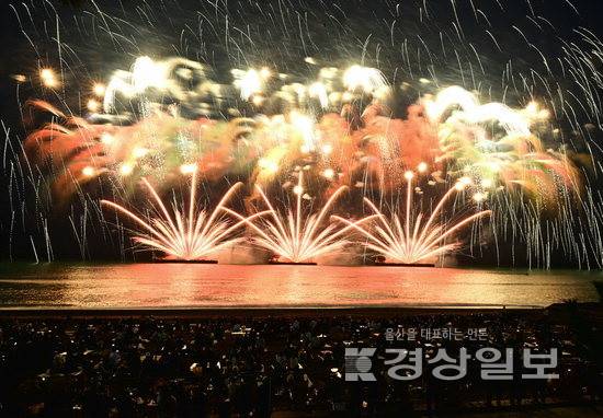 '2025 울산불꽃축제'가 26일 울산 북구 강동몽돌해변에서 열렸다. 불꽃축제는 지난 19일과 24일 울산 앞바다 풍랑주의보 등 날씨 영향으로 부득이 연기됐다가 수만발의 불꽃이 이날 북구 해변의 밤하늘을 수놓았다. 시민들은 일상 속 특별한 이벤트를 즐기기 위해 이날 일찌감치 자리를 확보하는 등 많은 관심을 나타냈다. 오랜만에 몰려온 관광객들로 강동 일원의 상가들은 지난주에 이어 2주 연속 특수를 누렸다.