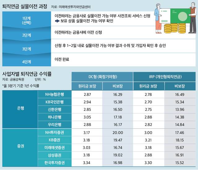 하지만 제도 시행 이후에는 보유 중인 자산을 해지하지 않고 다른 금융사로 이전할 수 있게 됐다. 예를 들어 은행에서 운용하던 개인형퇴직연금(IRP) 계좌를 증권사로 옮기면 기존 상품을 그대로 유지한 채 운용 주체만 변경된다.