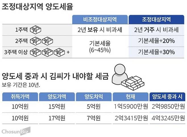 김씨가 10년 전 10억원에 매입한 의왕시 소재 A아파트를 15억원에 팔아 5억원의 양도차익(양도가액-취득가액)을 거뒀다고 가정해 보자. 양도차익 5억원에서 장특공제(20%, 1억원), 기본공제(250만원)를 뺀 과세표준에 세율(양도차익 5억원 이하 40%)을 곱하면 현재는 내야 할 양도세가 1억5900만원이다. 그러나 다주택자 중과 조치 시행 시 장특공제를 적용받지 못하는 데다, 세율이 60%(40%+20%)가 돼 양도세가 2억9850만원으로 늘어난다. 만약 이 집을 17억원에 팔았다면, 양도차익 7억원에 대한 양도세는 2억3000만원에서 4억3000만원가량으로 늘게 된다. 주택을 팔아 번 돈의 절반 이상을 세금으로 내야 하는 셈이다.
