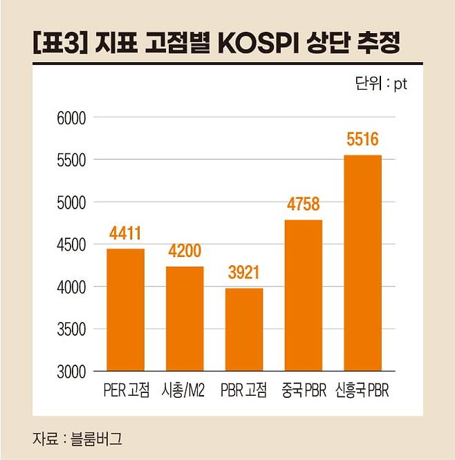 예를 들어 한국 시장 밸류에이션이 상향 재평가되어 9월 말 기준 신흥국(이머징마켓) 수준(PBR 2.1)까지 이른다면 KOSPI는 최고 5516까지 오를 수 있고 중국(PBR 1.8) 수준까지만 올라도 KOSPI는 4758까지 상승이 가능하다.