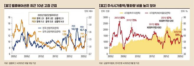 이 비율은 9월 말 현재 59%로 향후 주식시장 호조가 계속되어 과거 고점인 67%까지 오른다면 KOSPI는 4200까지 오를 수 있다. 다만 이는 주식시장 내에서 신규 상장이나 증자 등 여러 조건에 변화가 없다는 단순화된 가정에 의한 것이다.