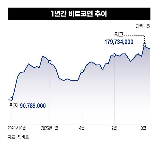 10월 들어선 더 큰 폭으로 뛰었다. 10월마다 비트코인 가격이 상승세를 보이는 이른바 ‘업토버(Uptober)’와 글로벌 유동성 확대에 따른 ‘에브리싱 랠리’(안전자산과 위험자산이 동시에 상승) 기대감이 겹치며 상승장이 펼쳐졌다. 10월 5일 12만5000달러를 돌파한 후 이틀 만에 12만6000달러를 터치하며 사상 최고가를 새로 썼다. 9월 말(11만 달러 선)과 비교하면 일주일 새 약 14% 오른 셈이다. 시가총액이 2조2000억 달러를 넘어선 대형 자산임을 감안하면 이례적인 상승폭이다.