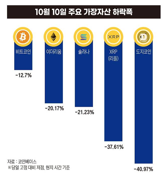 하지만 상승 랠리는 오래가지 않았다. 10월 10일 가상자산 시장이 급락했다. 시총 4000억 달러가 증발했다(트레이딩뷰). 비트코인 가격은 이날 고점 대비 12.7% 떨어졌고 알트코인은 낙폭이 더 컸다. 이더리움이 20.17%, 솔라나 21.24%, 리플(XRP) 37.61%, 도지코인이 40.97% 각각 떨어졌다. 같은 날 미국 대형 기술주 엔비디아(-4.89%), 아마존(-4.99%), 메타(-3.85%), 애플(-3.45%)보다 하락폭이 훨씬 컸다. 시장에선 트럼프 대통령의 ‘중국산 100% 추가 관세’ 발언이 촉매가 됐다는 분석이 나온다.