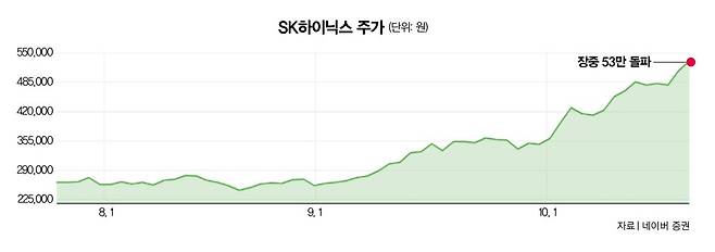 SK하이닉스가 '50만닉스' 시대를 열었다. 10월 21일 SK하이닉스는 사상 처음으로 장중 50만 원을 돌파하고 27일 장중 53만 원대로 올라서며 신고가를 새로 썼다(그래프 참조).