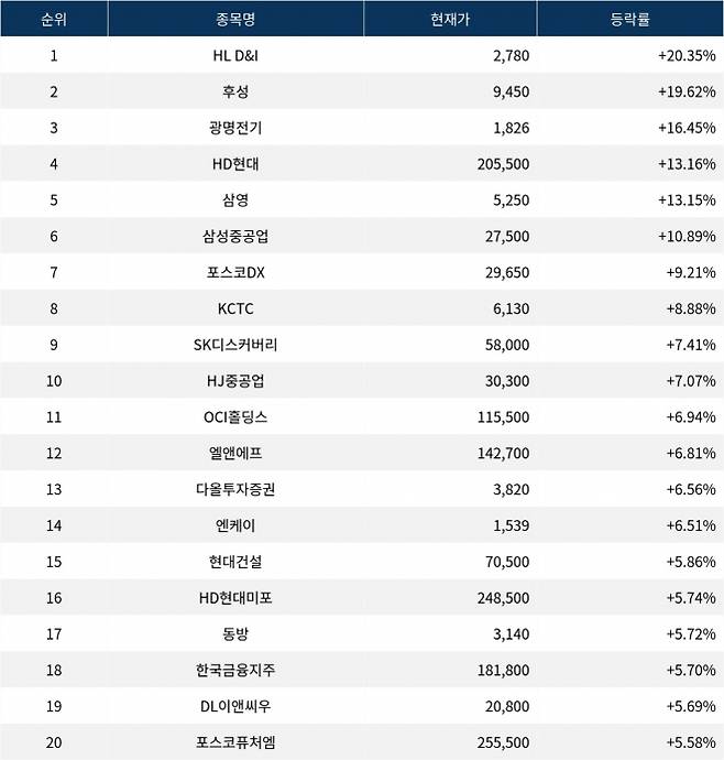 6위 삼성중공업(010140)은 현재가 27,500원으로 10.89% 상승 중이다. 7위 포스코DX(022100)는 현재가 29,650원으로 9.21% 상승 중이다. 8위 KCTC(009070)는 현재가 6,130원으로 8.88% 상승 중이다. 9위 SK디스커버리(006120)는 현재가 58,000원으로 7.41% 상승 중이다. 10위 HJ중공업(097230)은 현재가 30,300원으로 7.07% 상승 중이다.