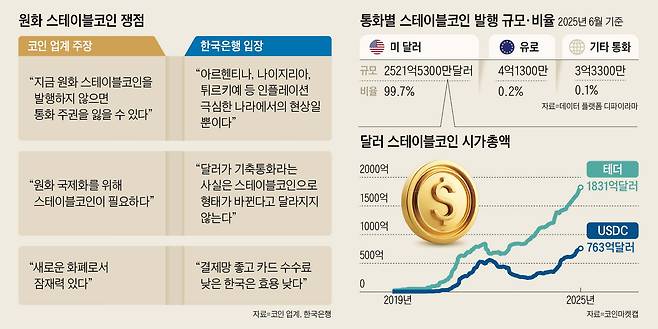 한은은 원화 스테이블코인이 발행되더라도 원화가 국제적으로 널리 쓰이는 등의 확산은 어렵다고 보고 있다. 이날 기자 설명회에서 박준홍 금융결제국 결제정책팀장은 “화폐는 기술이 아니라 신뢰”라고 강조했다. 가상 화폐 세상이라 하더라도, 미 달러에 대한 압도적인 신뢰를 기반으로 한 달러의 지배력에 원화 스테이블코인이 도전하기는 불가능하다는 뜻이다. 일본과 유럽연합(EU)도 스테이블코인 관련법을 제정했지만 전 세계 약 2530억달러 스테이블코인 시장의 99.7%는 미 달러 기반(지난 6월 기준)이다.