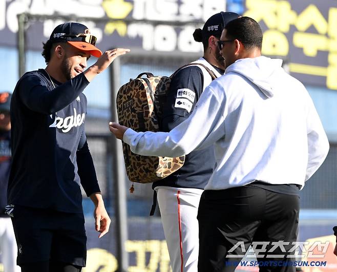 27일 서울 잠실구장에서 열린 한화와 LG의 한국시리즈 2차전. 리베라토와 치리노스가 인사를 나누고 있다. 잠실=허상욱 기자wook@sportschosun.com/2025.10.27/