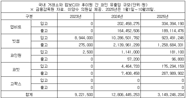 업비트는 2023년 전무했던 유출입이 지난해 3억6천691만원으로 크게 늘었고, 코인원은 2천500원에서 120만원으로 늘었지만 비교적 미미했다.
