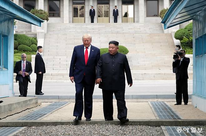 | 2019년 성사됐던 ‘판문점 회동’ 도널드 트럼프 미국 대통령(왼쪽)이 2019년 6월 30일 김정은 북한 국무위원장과 만나 군사분계선을 넘어 북측으로 갔다가 다시 김 위원장과 함께 남측으로 넘어오고 있다. 당시 트럼프 대통령은 일본에서 주요 20개국(G20) 정상회의를 마친 뒤 6월 29일 오전 방한하기 직전 트위터에 “김 위원장이 이것을 본다면 비무장지대(DMZ)에서 그를 만나 악수를 나누고 인사를 할 수 있을 것”이라고 밝혔다. 트럼프 대통령의 즉흥적인 제안 32시간 만에 남북미 판문점 회동이 성사됐다. 판문점=박영대 기자 sannae@donga.com |
