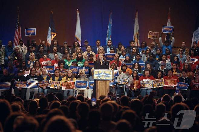 (뉴욕 AFP=뉴스1) 이정환 기자 = 미국 진보진영의 아이콘으로 불리는 알렉산드리아 오카시오코르테스 하원의원이 26일(현지시간) 뉴욕시 퀸즈 자치구 포리스트 힐스 스타디움에서 열린 뉴욕 시장 후보 조란 맘다니 지지 선거 유세에서 연설하고 있다. 뉴욕 시장 선거는 2025년 11월 4일에 치러진다. 2025.10,26.
