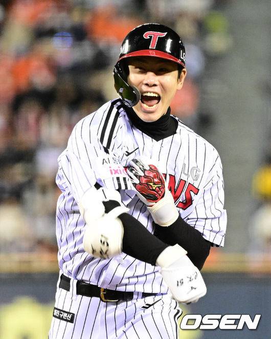 2회말 1사 2루에서 LG 홍창기가 우중간 적시타를 치고 환호하고 있다. 2025.10.27 /sunday@osen.co.kr