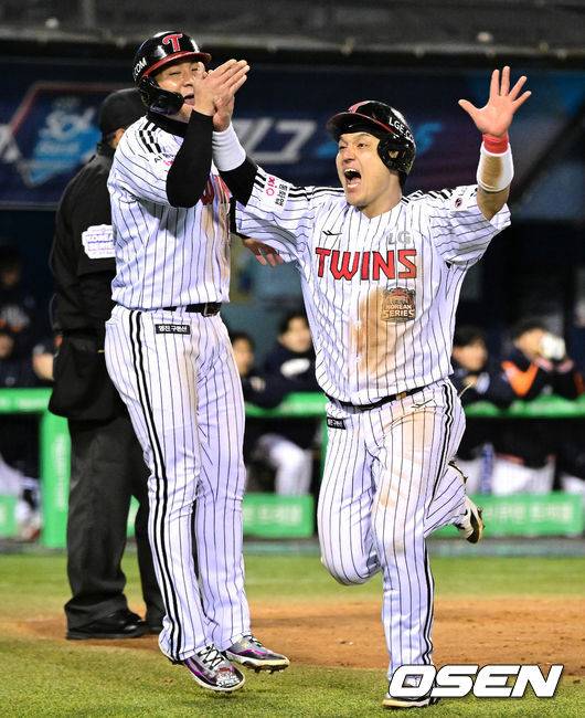 2회말 1사 2,3루에서 LG 구본혁의 우중간 2타점 적시타 때 홈을 밟은 박동원이 환호하고 있다. 2025.10.27 /sunday@osen.co.kr