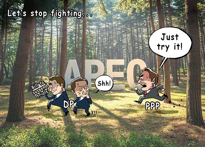 The ruling Democratic Party has called for a temporary halt to political strife during the APEC 2025 Summit in Gyeongju, urging all parties to prioritize national unity over partisanship. However, the party is simultaneously pushing a controversial bill to suspend all ongoing criminal trials involving President Lee Jae Myung, claiming it is necessary to ensure stable governance. The opposition People Power Party has fiercely objected, accusing the ruling bloc of hypocrisy and attempting to shield the president from judicial scrutiny under the guise of political calm. [PARK YONG-SEOK]