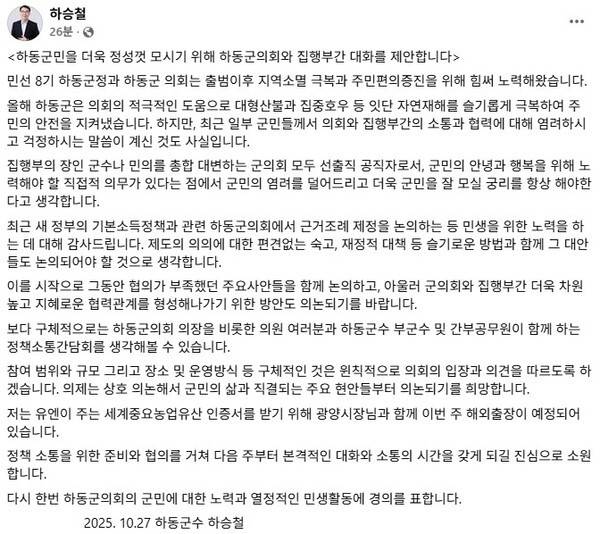 하승철 하동군수가 그동안 지속적인 갈등을 빚어온 하동군의회와의 관계 회복을 위해 공식적인 대화 채널 신설을 제안했다. 하 군수는 27일 자신의 사회관계망서비스(SNS)를 통해 '하동군민을 더욱 정성껏 모시기 위해 하동군의회와 집행부 간 대화를 제안합니다'라는 글을 게시하고, "군의회 의장과 의원, 군수, 부군수 및 간부공무원이 참여하는 정책소통 간담회 개최를 제안한다"고 밝혔다.