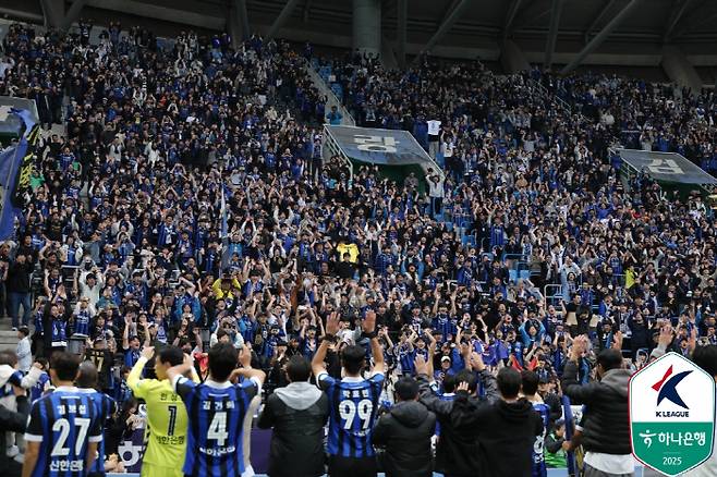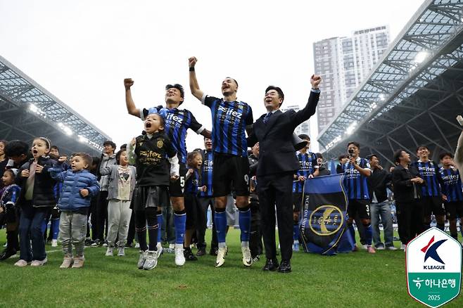 26일 인천축구전용구장에서 열린 '하나은행 K리그2 2025' 36라운드 인천과 경남FC의 맞대결, 인천은 제르소 무고사 바로우의 연속 득점에 힘입어 3대0 완승을 거뒀다. 승리와 함께 인천(승점 77)은 2위 수원삼성(승점 67)과의 격차를 10점으로 벌리고 남은 3경기 결과와 상관없이 조기 우승을 확정했다. K리그2 강등 이후 단 한 시즌 만에 K리그1으로 승격한 역대 6번째 팀으로 이름을 올렸다.