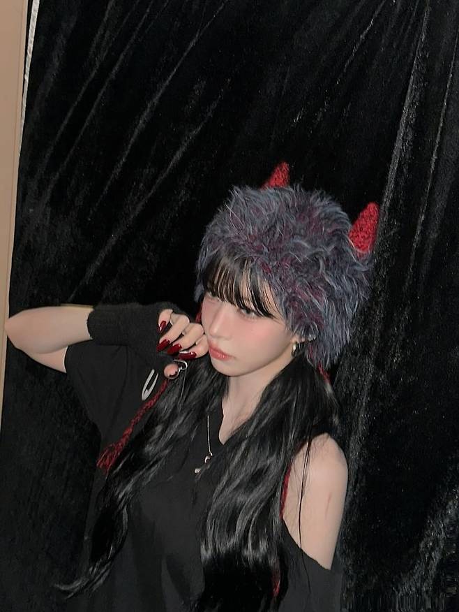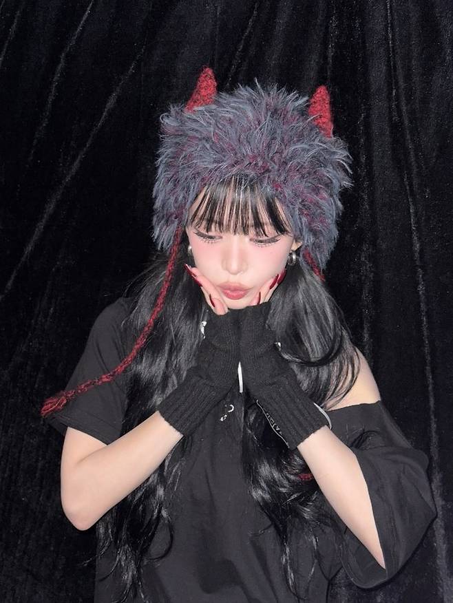공개된 사진에서 채영은 붉은 뿔 디테일이 돋보이는 퍼 모자와 컷아웃 디테일의 블랙 티셔츠, 핑거리스 장갑을 매치해 키치하면서도 시크한 무드를 자아냈다.