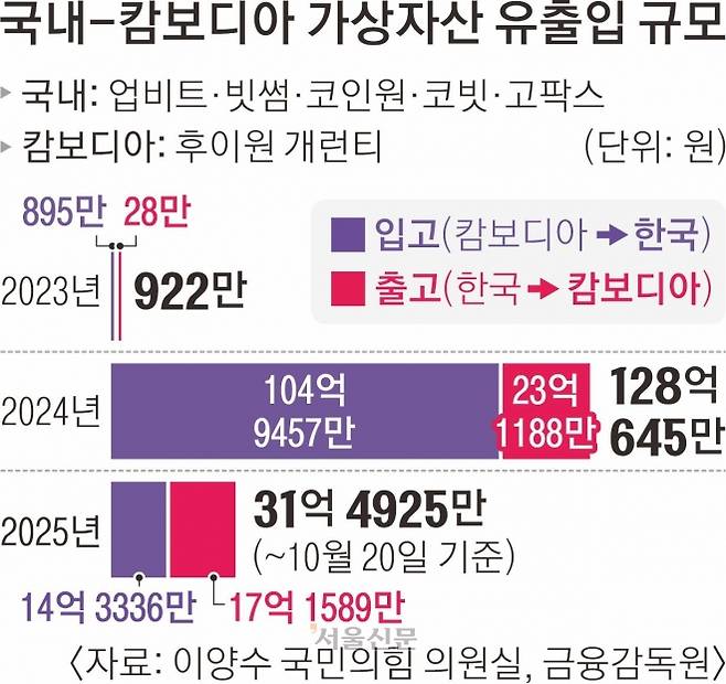 2023년까지는 입고(캄보디아→한국) 895만원, 출고(한국→캄보디아) 28만원 수준이었지만, 지난해에는 입고 104억 9457만원, 출고 23억 1188만원으로 뛰었다. 올해에도 지난 20일까지 총 31억 4925만원이 오갔다. 입·출고 가상자산은 대부분이 사용성이 좋은 달러 기반 스테이블코인 테더(USDT)였다.