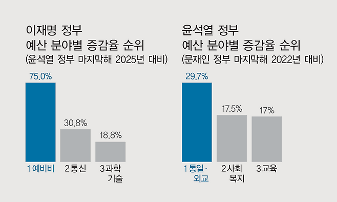 가장 큰 증가율을 보인 예비비(75%)가 우선 눈에 띈다. 4조2000억원을 편성했다. 윤석열 정부가 2025년 편성한 예비비 2조4000억원과 비교하면 1조8000억원 증가했다. 문재인 정부 마지막 해인 2022년 예비비는 3조9000억원 수준이었는데, 윤 정부에서 1조5000억원(-38.5%) 삭감된 것이 복구된 셈이다. 그러나 올해 예비비 삭감은 당시 더불어민주당이 다수인 국회 주도로 이뤄진 것이라 윤 정부의 의지라고 보기에는 무리가 있다. 그런데도 이 정부에서 예산이 늘어난 분야를 세부적으로 들여다보면 윤석열 정부와 ‘데칼코마니’를 이룬 것들이 적지 않게 있었다.