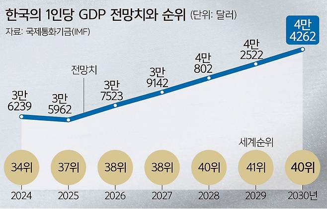 한국과 경제모델이 유사한 대만의 가파른 성장세와 대조적이다. 한국은 올해 GDP가 3만5962달러로 지난해(3만6239달러)보다도 감소할 것으로 전망(IMF)되지만, 대만은 올해 3만7827달러로 한국을 추월하며 격차를 벌려 나갈 것으로 예측된다. 한국의 GDP 4만달러 돌파는 2028년에야 가능할 전망이나 대만은 당장 내년도에 4만1586달러로 4만달러 돌파가 확실시되고 있다.