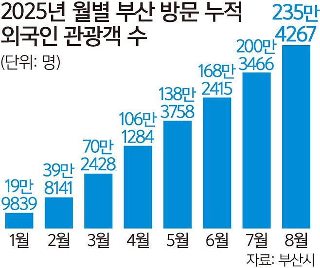 27일 부산시에 따르면 올해 부산을 찾은 외국인 관광객은 지난 8월 말 기준 총 235만4267명으로, 외국인 관광객 역대 최초 300만명 달성을 눈앞에 두고 있다.