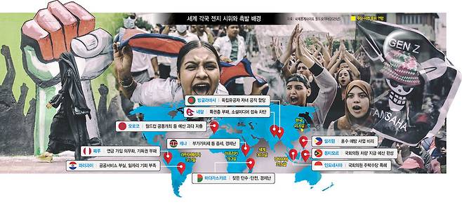 아시아에서 시작된 ‘제트(Z) 세대’(1997~2012년생·젠지) 청년 주도의 반정부 시위가 아프리카와 남미로 번지며 전 세계적 물결로 확산하고 있다. 지난 8월 말 네팔에서 ‘네포 키즈’(Nepo Kids)라 불리는 특권층 2세들의 사치 행태와 정부의 소셜미디어 차단에 분노한 제트 세대의 시위가 정권 교체로 이어진 지 두달. 이제는 마다가스카르·모로코·페루·파라과이 등지에서도 같은 세대가 “청렴·공정·기회·민주주의”를 외치며 거리로 쏟아져 나오고 있다. 시위가 촉발된 나라들은 공통적으로 청년층 비중이 많고 실업률이 상대적으로 높고, 특권층의 부패와 경제적 불평등이 심화돼 있다는 점이 지목된다.