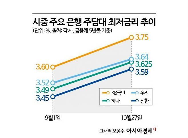 주담대 금리 산정 기준이 되는 금융채 금리가 상승한 데다, 은행들이 가계부채 관리를 위해 자체적으로 가산금리를 높게 유지하면서다.