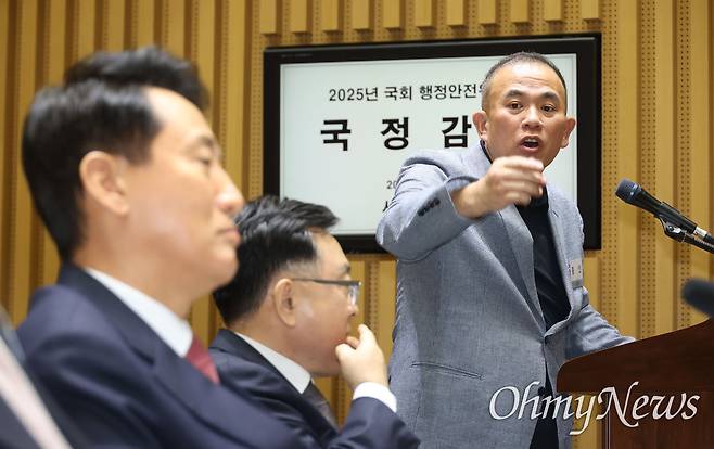 | ▲ 명태균씨가 지난 23일 오후 서울 중구 서울시청에서 열린 국회 행정안전위원회 서울특별시에 대한 국정감사에 증인으로 출석해 오세훈 서울시장을 쳐다보며 의원 질의에 답변하고 있다. |