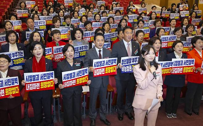 | ▲ 국민의힘 장동혁 대표, 의원들과 전국 지방 여성의원들이 22일 국회 의원회관에서 열린 전국여성 지방의원 워크숍에서 정부의 부동산 정책을 비판하는 손팻말을 들고 구호를 외치고 있다. |