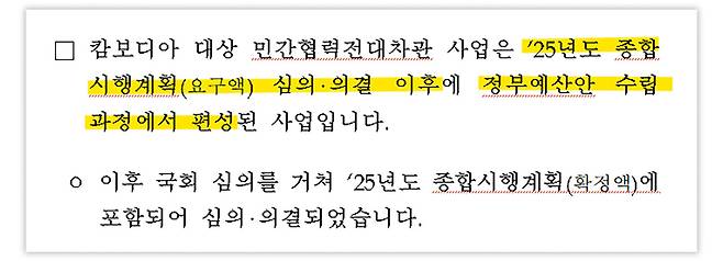 캄보디아 ODA 예산 편성 과정에 대한 검증을 이어나가고 있는 여당은, 이 부분에서 정치적 의도를 의심해봐야 한다고 지적합니다.